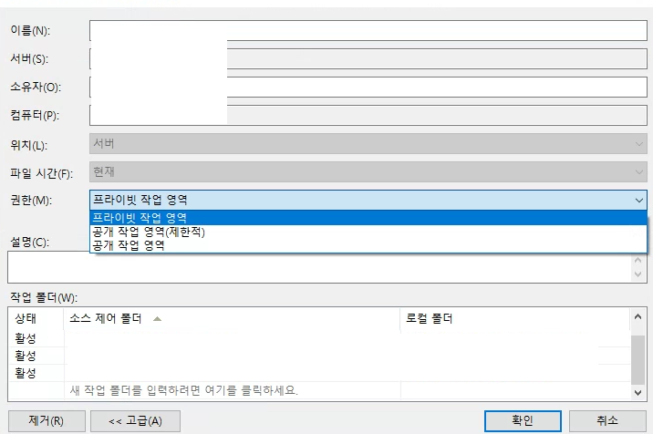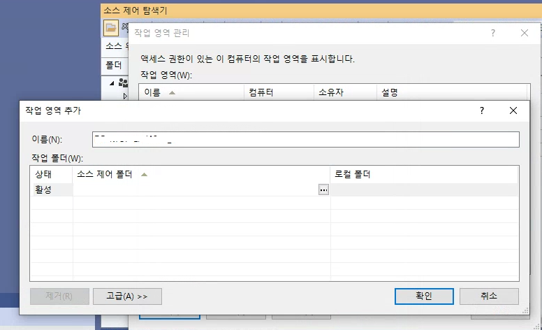 작업 영역 관리 팝업 > 추가 클릭 > 이름, 상태, 소스제어폴더, 로컬폴더 세팅 후 확인