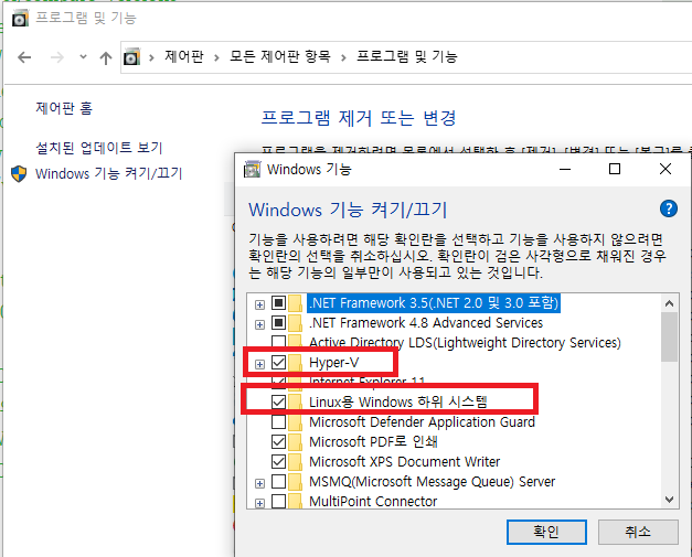 WSL2 와 Hyper-V를 설치하지 위해서 아래의 Windows 기능을 체크한 후 재부팅한다.