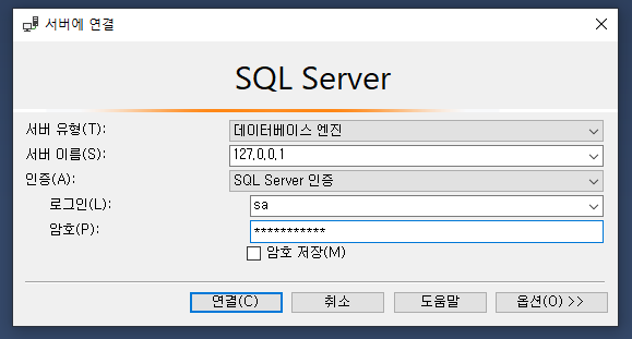 계정 : sa / docker-compose.yaml 파일에 지정한 암호