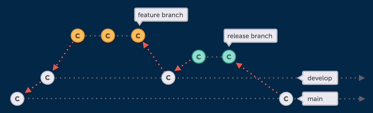 2) GitFlow : long-running(main + develop) + short-lived(featuers, releases, hotfixes)