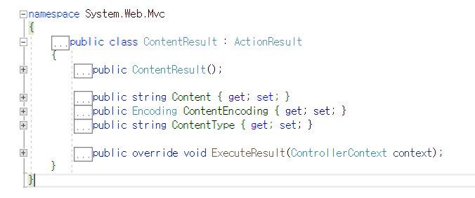 예를들면 ContentResult Class는 아래와 같이 ActionResult Class 클래스를 구현한다.