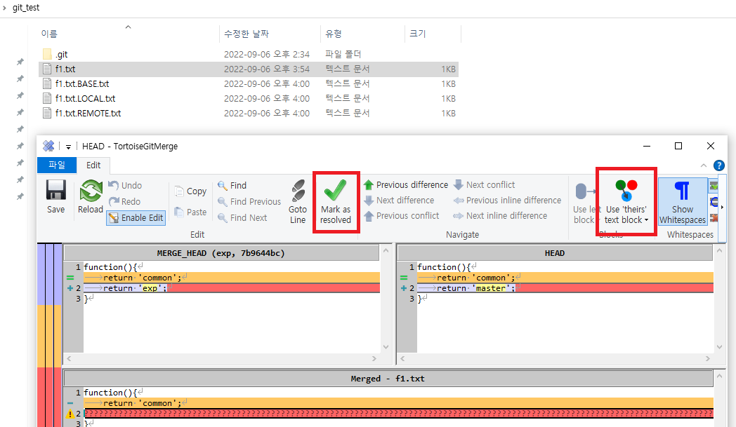 아래 화면에서 Use 'theirs' text block 버튼을 클릭해서 원하는 text block을 선택할 수 있고, 아니면 직접 타이핑해서 Merged f1.txt파일을 수정할 수 있다.