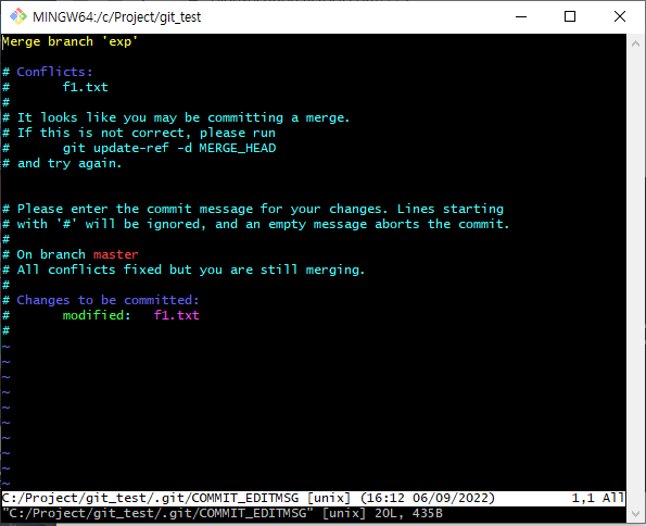 commit하면 Merge branch 'exp'라는 제목의 자동 commit message가 표시된다.