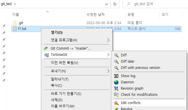 이제 TortoiseGit이라는 Git GUI프로그램을 이용해서 충돌된 파일을 처리해보자.