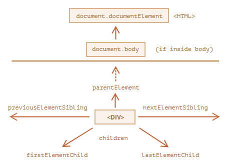 - For element nodes only: parentElement, children, firstElementChild, lastElementChild, previousElementSibling, nextElementSibling.