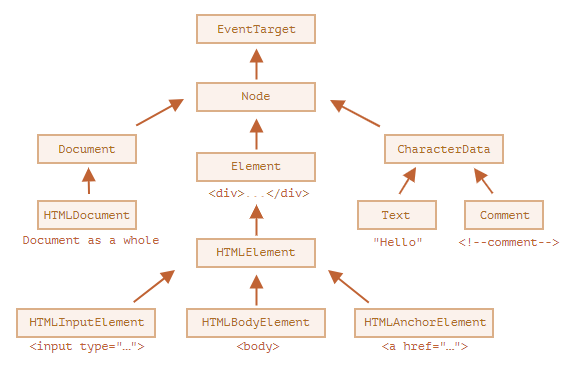 다른 DOM nodes는 다른 properties를 갖고 있다. 예를들어 <a> tag에 해당하는 element node는 link와 연관된 properties를 갖는다. 하지만, 공통 properties와 함수도 있다. DOM nodes의 모든 class는 하나의 hierarchy에서 나왔기 때문이다.