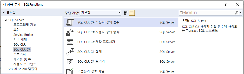 2. 프로젝트 선택 후 추가 -> 새항목 -> SQL CLR C# -> SQL CLR C# 사용자 정의 함수 추가