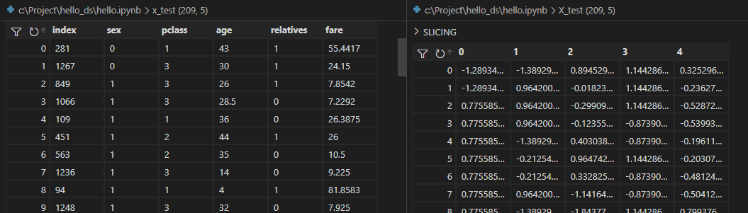 왼쪽은 x_test 변수 data이고 오른쪽은 X_test 변수 data이다.