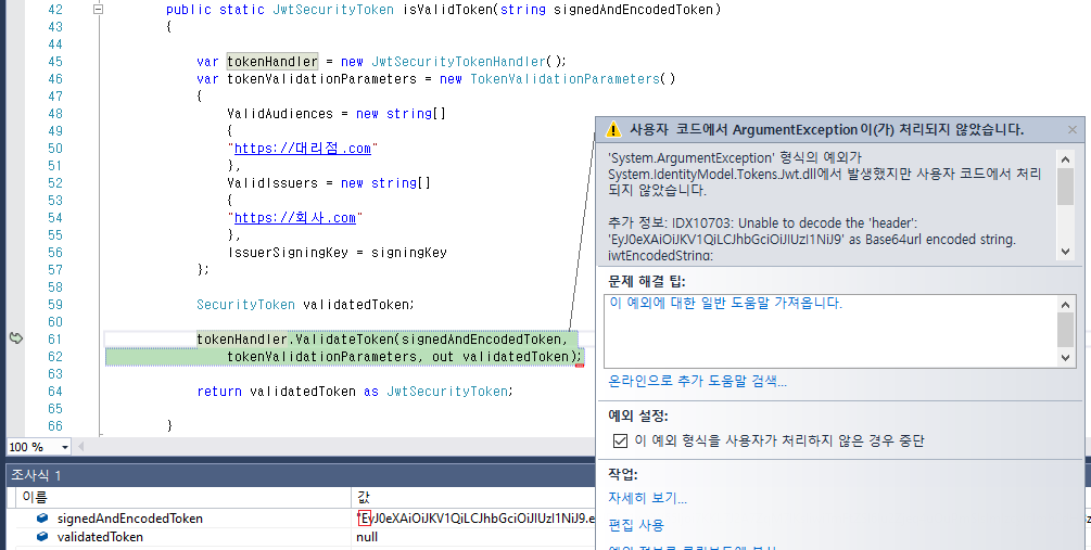 "ExceptionMessage": "IDX10703: Unable to decode the 'header': 'EyJ0eXAiOiJKV1QiLCJhbGciOiJIUzI1NiJ9' as Base64url encoded string. jwtEncodedString: 'EyJ0eXAiOiJKV1QiLCJhbGciOiJIUzI1NiJ9.eyJDb21wYW55Ijoi7KKL7J2A7ZqM7IKsIiwiTmFtZSI6Iu2Zjeq4uOuPmSIsImlzcyI6Imh0dHBzOi8v7ZqM7IKsLmNvbSIsImF1ZCI6Imh0dHBzOi8v64yA66as7KCQLmNvbSIsImV4cCI6MTYwNjAyNDUxNywibmJmIjoxNjAzNDMyNTE3fQ.9Fz3mAtdt5FHdvRLbUAHqxzDS1G62j4G4ukEcnUatSY'.",