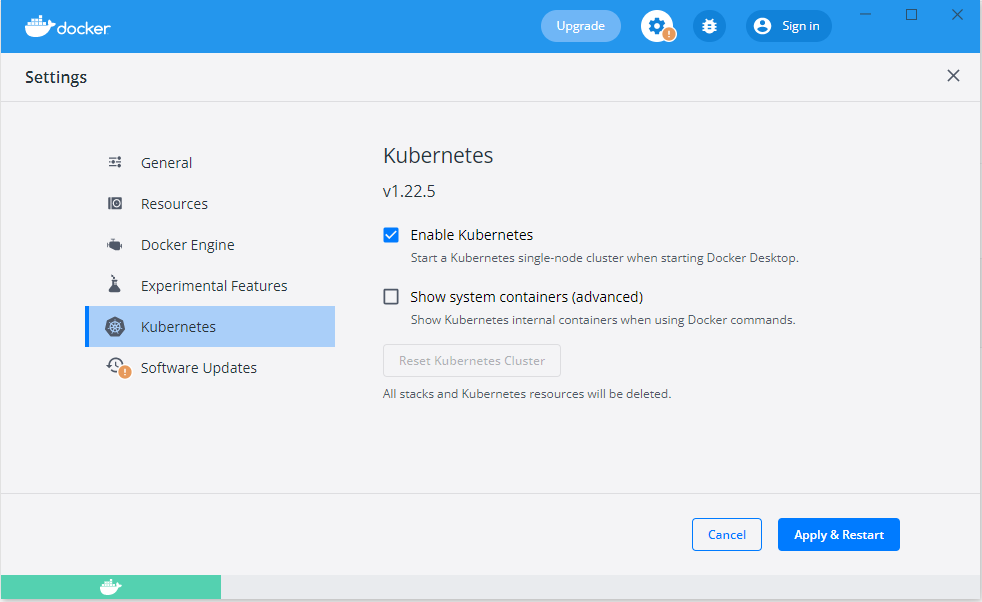 Settings > Kubernetes 에서 Enable Kubernetes 체크확인 후, 되어 있지 않으면 체크 후 Apply & Restart 한다.