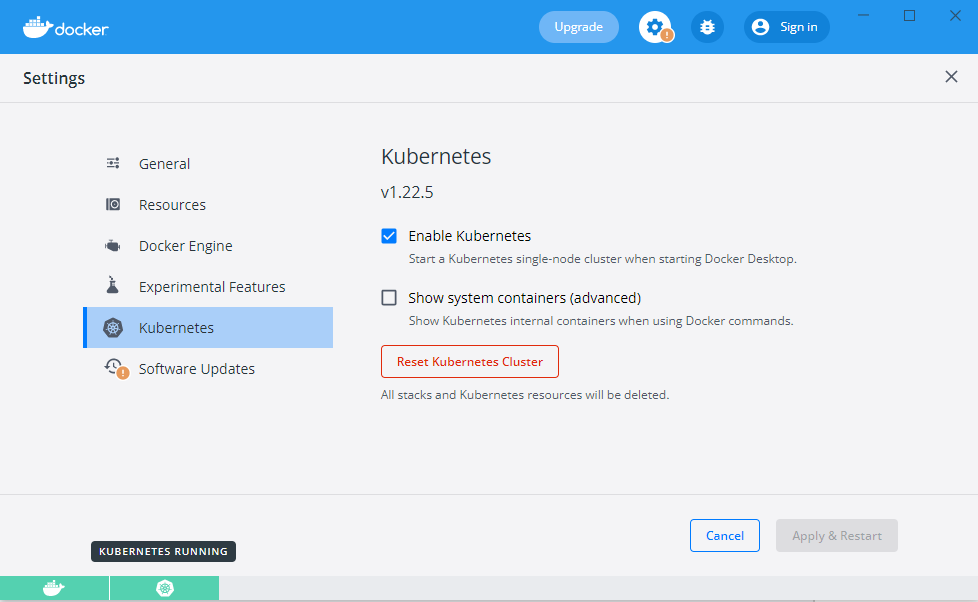 Settings > Kubernetes 에서 Enable Kubernetes 체크확인 후, 되어 있지 않으면 체크 후 Apply & Restart 한다.