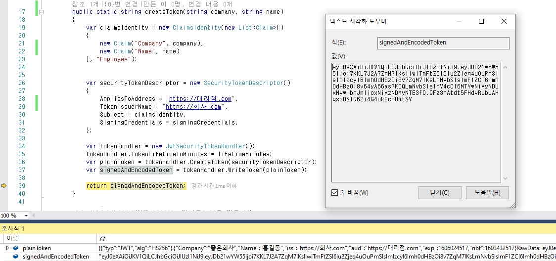 string token = clsJWT.createToken("좋은회사", "홍길동");