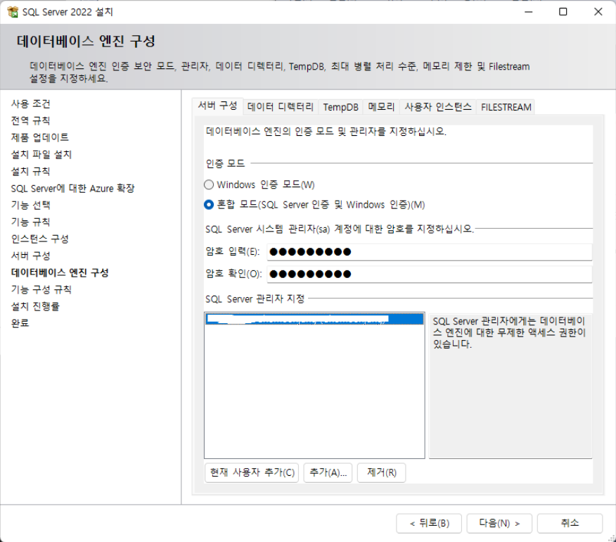 혼합모드를 선택하고, sa 계정에 대한 암호를 입력한다.