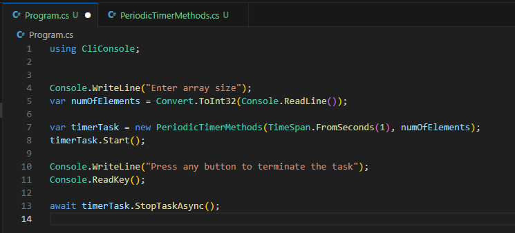 var timerTask = new PeriodicTimerMethods(TimeSpan.FromSeconds(1), numOfElements);