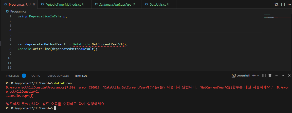 GetCurrentYearV1() 함수에 ObsoleteAttribute를 사용하므로 deprecated method임을 표시한다.