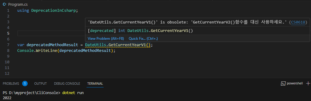 GetCurrentYearV1() 함수에 ObsoleteAttribute를 사용하므로 deprecated method임을 표시한다.
