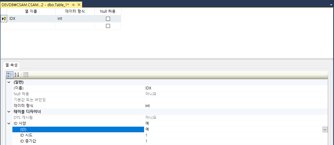 MSSQL에서는 테이블 생성 시, ID사양 증가값 설정으로 Auto Incremet 처리가 가능하다.
