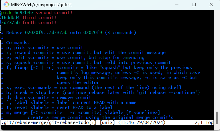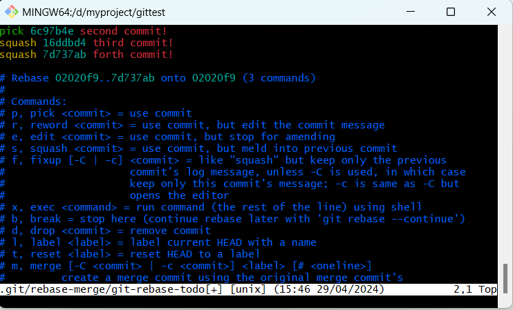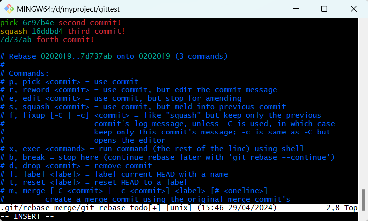 Esc 키를 누르면 lines에 squash가 모두 입력이 된 것을 확인할 수 있다.