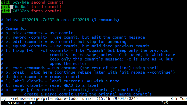 Ctrl+V에서 다시 수정하기 원하는 lines을 선택한다. 그 다음 Shift+i 로 insert mode에서 squash를 입력한다.