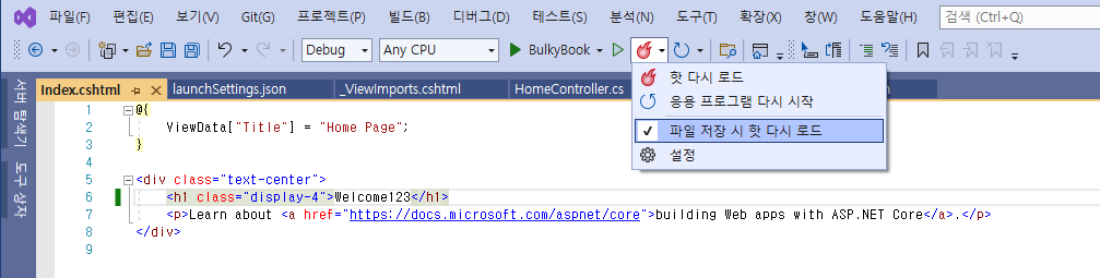 디버깅 시, '파일 저장 시 핫 다시 로드'를 선택하면 reload없이 cshtml파일이 수정 저장될 때마다 적용된 view를 확인할 수 있다.