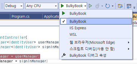 1) IIS Express를 선택해서 실행할 수도 있고, 프로젝트명을 선택해서 실행할 수도 있다.