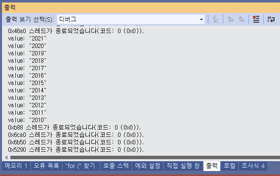 노란색 TracePoint가 생성되지 않고 소스가 실행된다. 출력창에서 디버깅 값 확인이 가능하다.