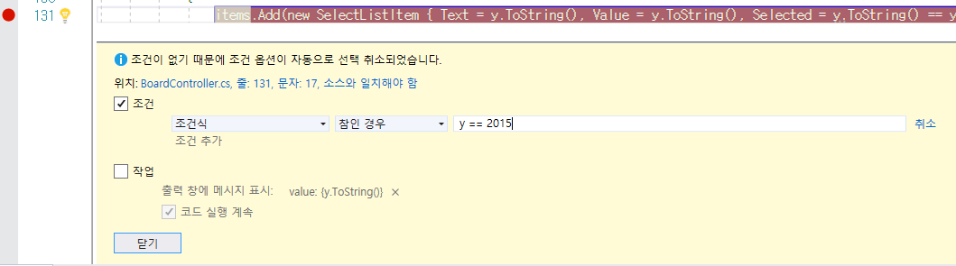 BreakPoint에 조건을 추가하고 닫기 -> Plus Icon의 BreakPoint가 생긴다. -> 디버깅을 실행 -> 조건이 참일때 pause된다.