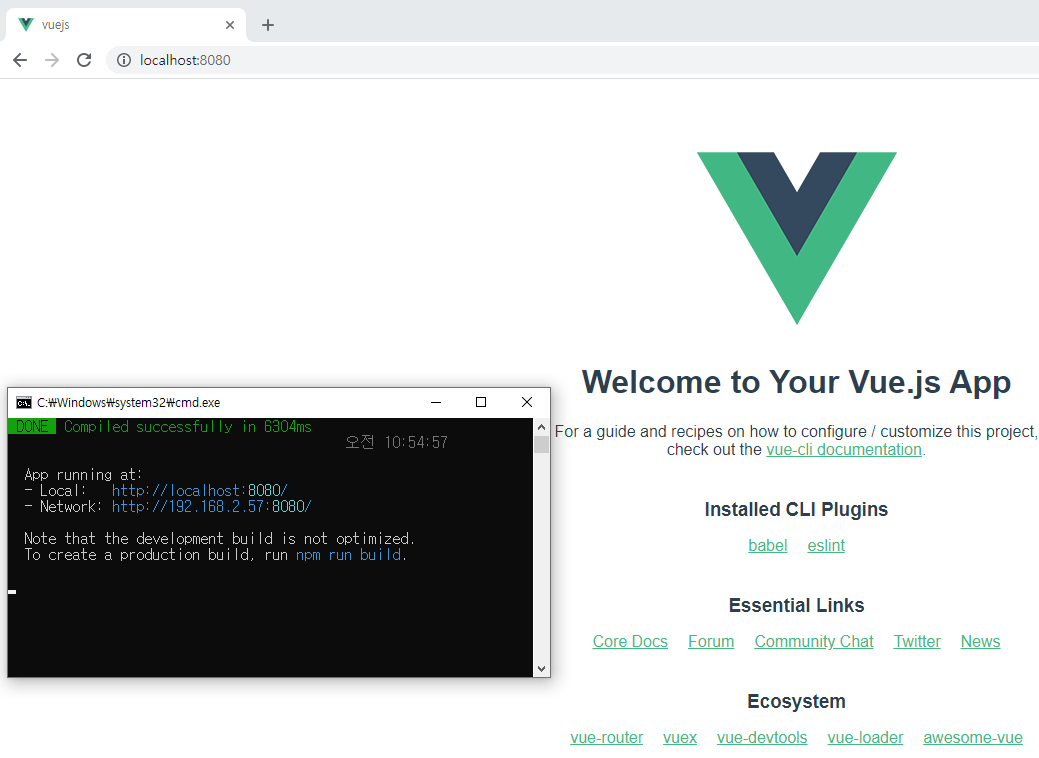 npm run serve 하고 브라우저에서 localhost:8080 으로 접속하면 Vue.js의 기본 화면을 볼 수 있다.